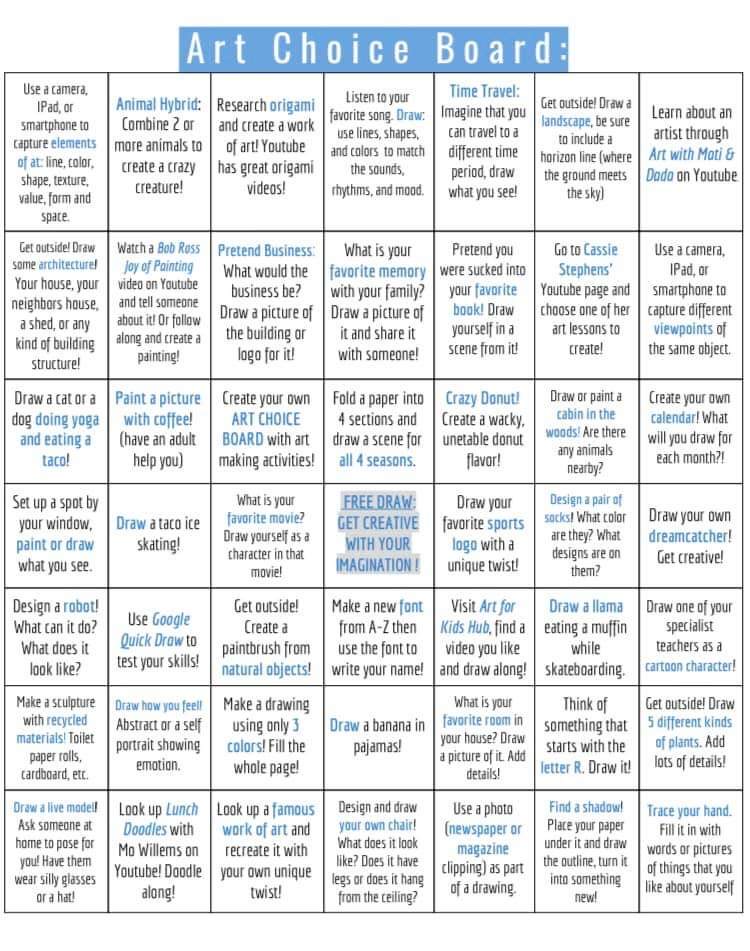 Pick and choose your own challenges using this choice grid. You could choose to complete 1 a day, a week or a month. Have some fun with your choices, perhaps aim to complete a ‘line’ or roll a dice to allow fate to make the decision for you!