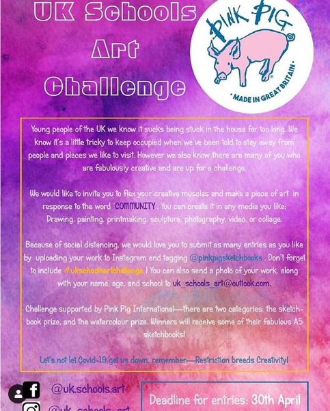 Email a photo of your work to uk_schools_art@outlook.com & tag @pinkpigsketchbooks on Instagram #ukartschools.