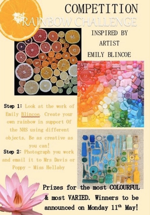 Take part in our latest challenge inspired by the work of Emily Blincoe. Simply create your own rainbow in support of the NHS using different objects creatively.